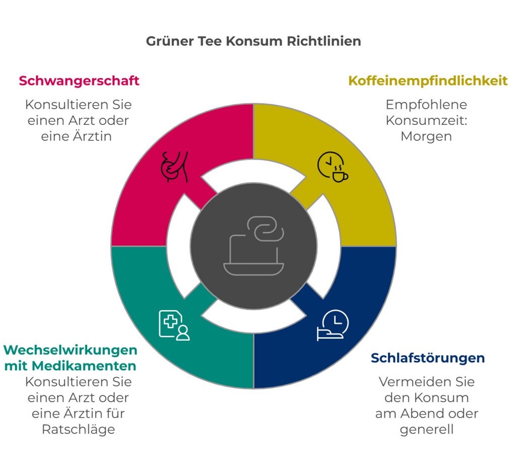 3. Medikamenteneinnahme: Grüner Tee kann die Wirkung bestimmter Medikamente beeinflussen. Bei Unsicherheiten sprechen Sie mit Ihrem Arzt oder Ihrer Ärztin.