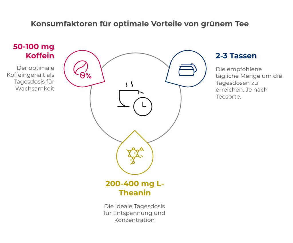 Um von den Vorteilen zu profitieren, sollten Sie etwa 2–3 Tassen grünen Tee pro Tag trinken. Das entspricht etwa 200 mg L-Theanin und 50–100 mg Koffein, abhängig von der Teesorte.