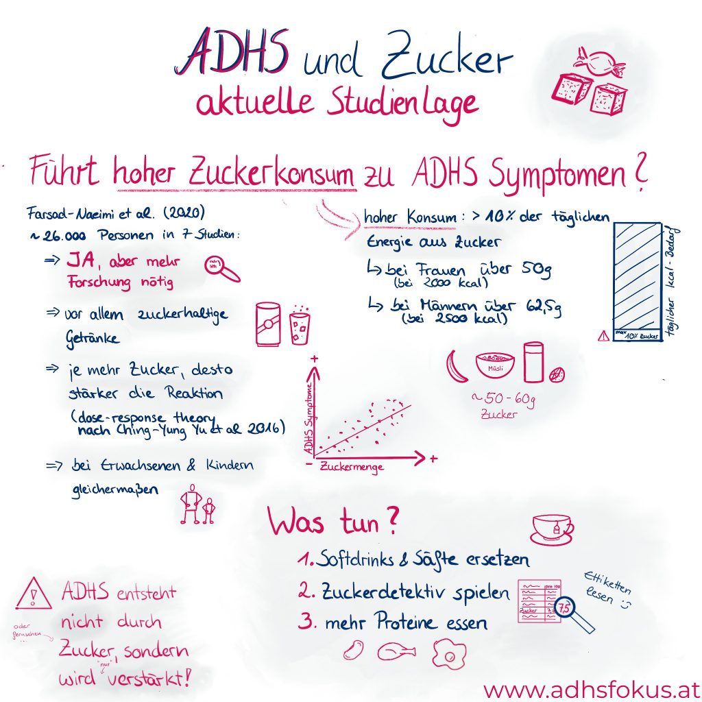 Die Ergebnisse dieser Meta-Analyse deuten darauf hin, dass es einen positiven Zusammenhang zwischen hohem Zuckerkonsum und einem erhöhten Risiko für ADHS-Symptome gibt (Farsad-Naeimi et al., 2020).