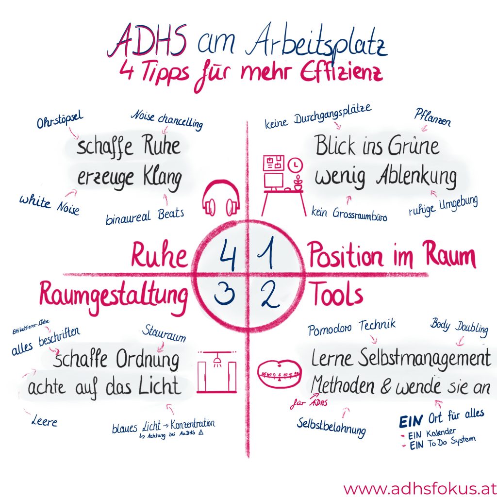 Mit ADHS kann es besonders schwerfallen, den Fokus zu behalten und Reize auszublenden. Deshalb sollten besonders die folgenden zwei Punkte beachtet werden, da der Aufwand gering, die Wirkung aber hoch ist :